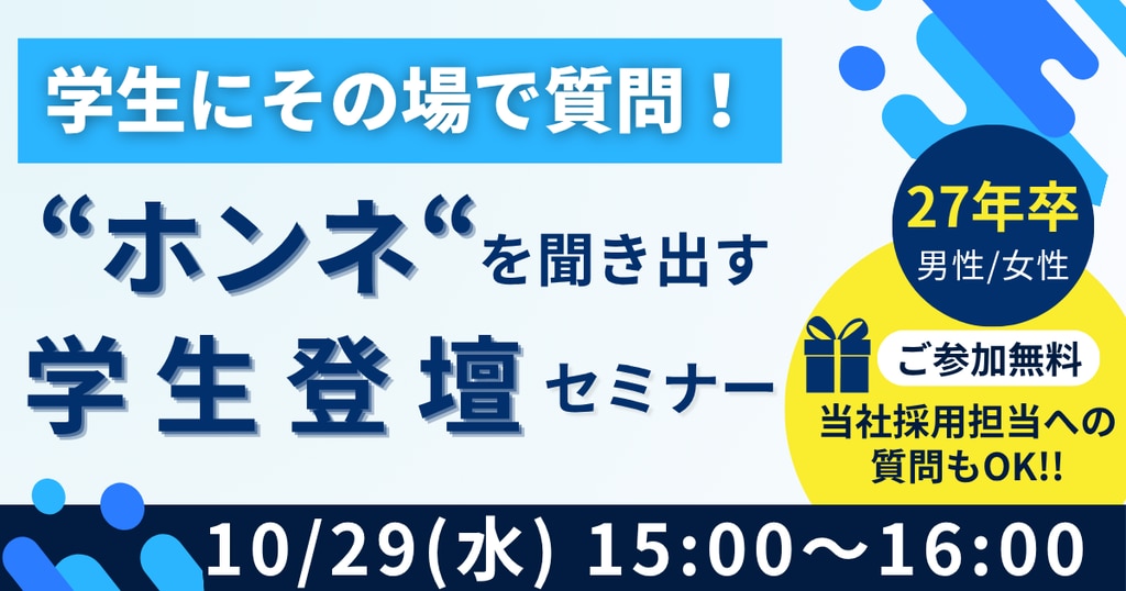 10/29(水) 15:00~ 学生にその場で質問! 27年卒学生のホンネを聞き出す、学生登壇セミナー