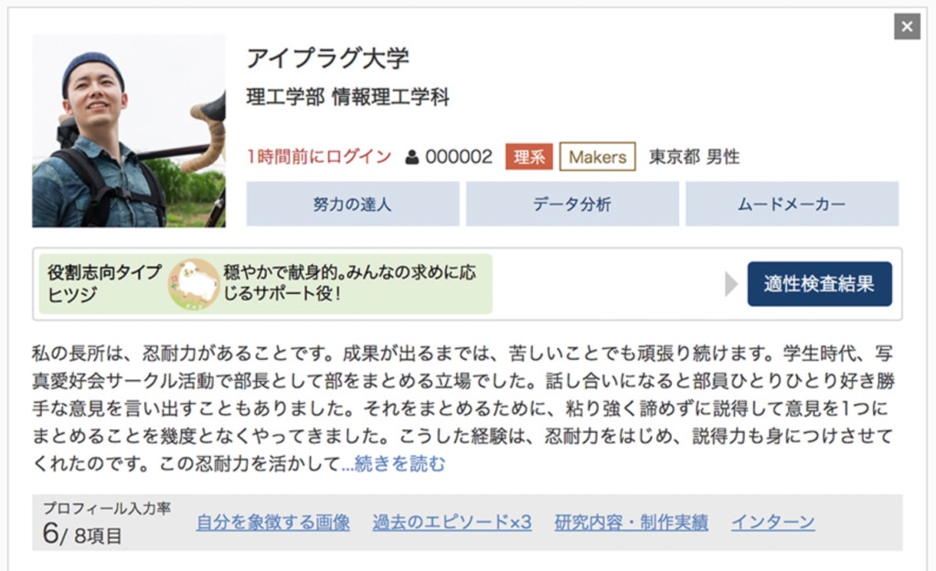 OfferBoxに登録している学生は、学歴やスキル情報に加え、自己PRや適性診断、価値観、志向性、自分を象徴する写真など34項目にわたるプロフィール情報を詳細に入力しています。これにより、企業は学歴など表面的な経歴だけでなく、人柄や考え方などを把握したうえでオファーすることが可能です。