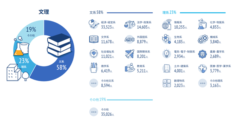 OfferBoxの登録学生は23万6,000人以上(2025年卒)にのぼり、新卒スカウトサービスとしては最も登録数が多く、就活生の2~3人に1人が登録していると言われています。登録学生は全国に分布、大学群、学部、学科など幅広い学生が登録しており、地方の学生や特定の専攻を持つ学生など、大手就職サイトではリーチしにくかった層へのアプローチも可能です。