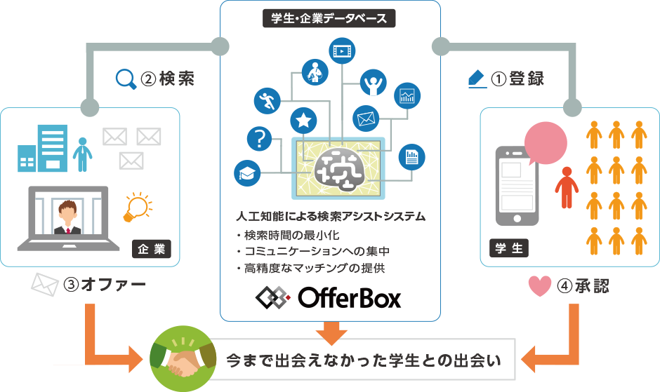 OfferBox(オファーボックス)は、従来の「待ち」の採用(求人広告)とは異なり、企業から学生へアプローチする「攻め」の採用ツールです。