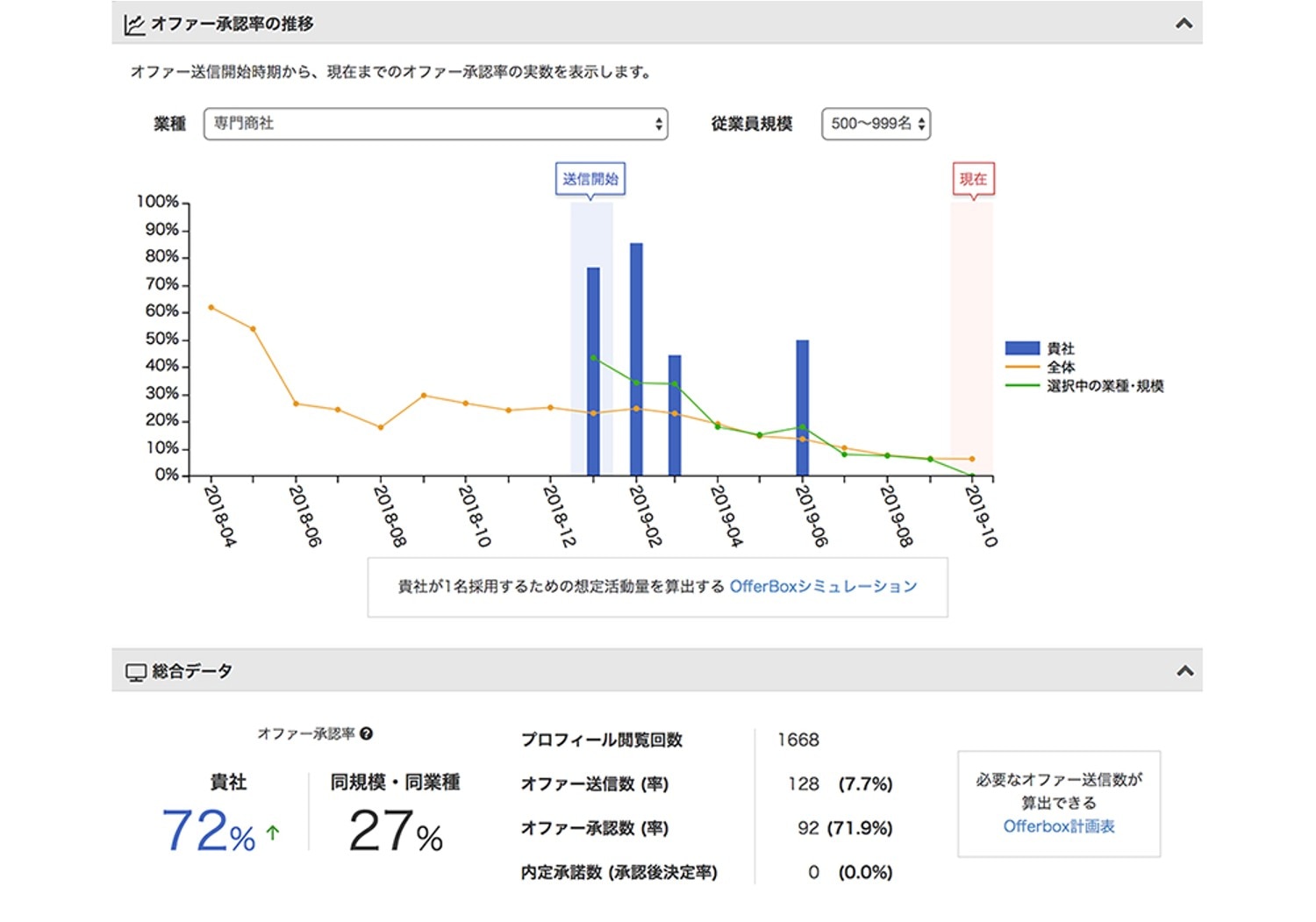 企業規模、業種、オファー送信時期を入力するだけで、オファー承認率(推定)が表示されます。目標採用数に向けて、どれくらいオファーをしないといけないのか、何人と接触できるか可視化され、年間の採用戦略立案に役立ちます