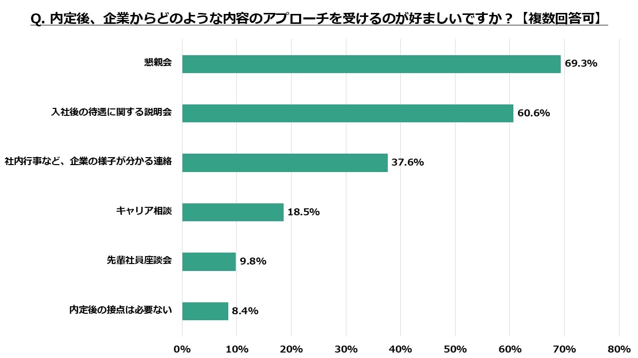 最も多く回答を集めたのは「懇親会」69.3%という結果となり、「入社後の待遇に関する説明会」60.6%、「社内行事など、企業の様子が分かる連絡」37.6%と続く結果となりました。