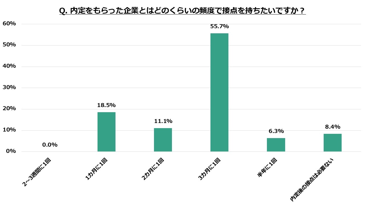 「内定後の接点は必要ない」は僅か8.4%と全体の1割にも満たなかったことからも、内定辞退を防ぐための過度な拘束や接触は避けつつも、コンスタントに学生との接点をもち、フォローアップしていくことが求められます。