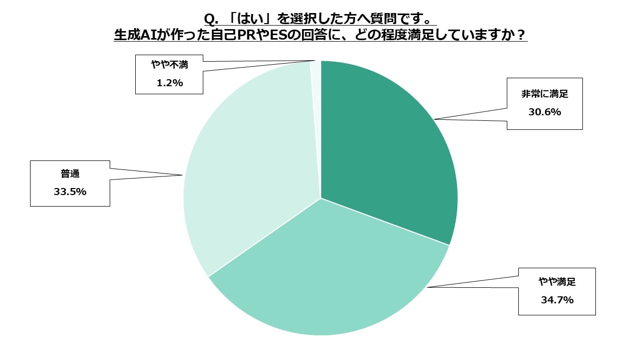 「非常に満足」が30.6%、「やや満足」が34.7%となり、合計で65.3%と、3分の2近くの学生が生成AIの回答に対してポジティブな評価をしていることがわかりました。