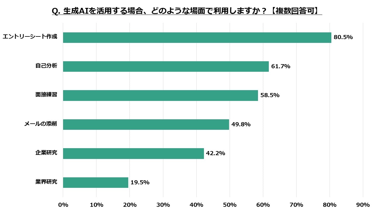 生成AIを単なる情報収集ツールとして活用するだけではなく、文章作成の効率化やブラッシュアップに生成AIを積極的に取り入れていることがうかがえます。また、「自己分析」と「面接練習」も5割を超えており、自身の考えを深めたりアウトプットの質を高めるための「伴走者」として生成AIを活用する新しい就活スタイルが定着しつつあるといえます。