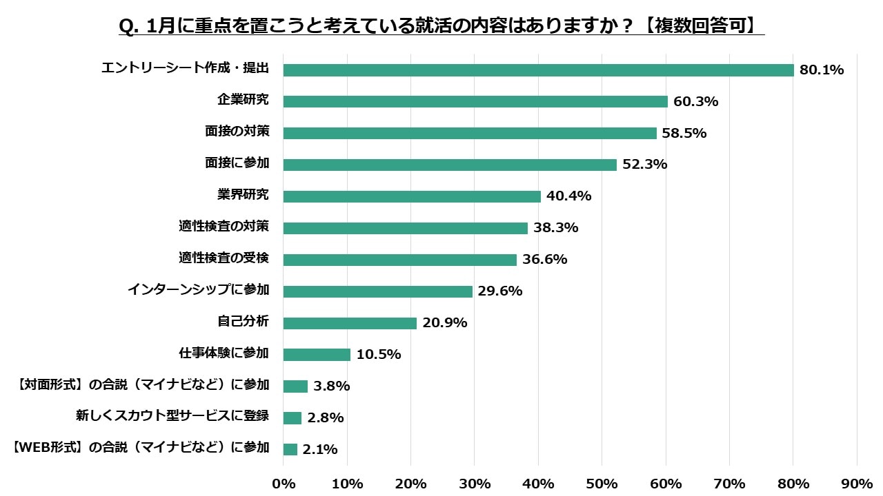 「エントリーシート作成・提出」が80.1%と最も多く回答を集め、「企業研究」60.6%、「面接対策」58.5%、「面接に参加」52.3%と続く結果となりました。