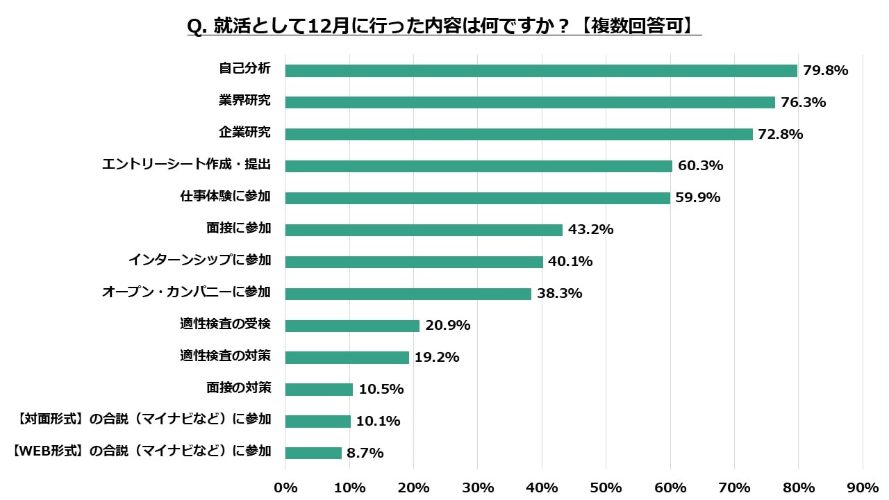 1位「自己分析」79.8%、2位「業界研究」76.3%、3位「企業研究」72.8%と上位3項目がいずれも7割を超える結果となりました。