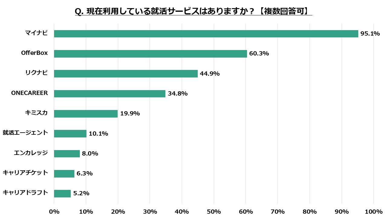 前月、前々月に引き続き1位「マイナビ」95.1%、2位「OfferBox」60.3%、3位「リクナビ」44.9%という結果となりました。