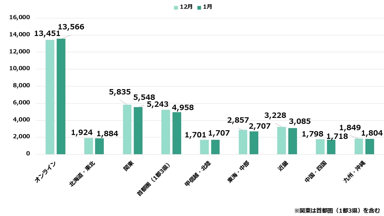 1月の開催地域別コース掲載社数では、「オンライン」が13,566社と前月をさらに上回り、依然として母集団形成の柱となっています。 対面型は「関東」が5,500社超で最多ですが、地方圏を含め多くのエリアで前月比微減となりました。