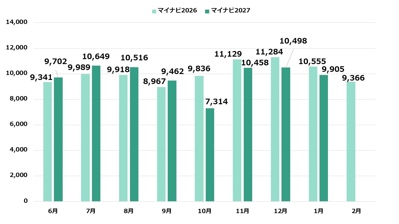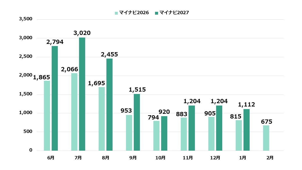 2026と比較すると6月~1月のトータルで6.7%増となり、27卒採用における企業の高い意欲が感じられます。