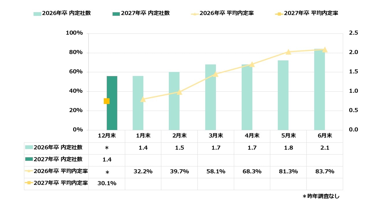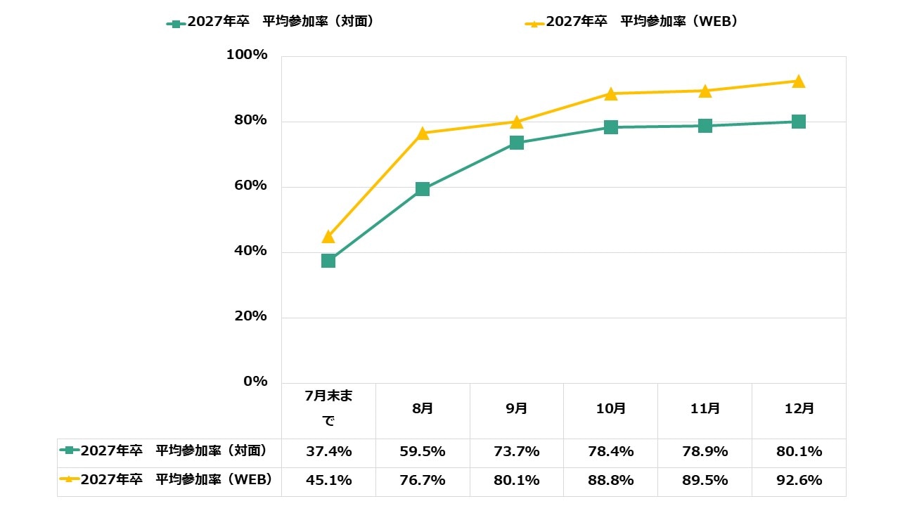 WEB参加社数が12.6社(前月比2.6社増)と増加しており、オンラインでの比較検討が加速しています。これに対し、対面は5.7社(前月比0.4社増)と微増にとどまっており、学生が「直接話を聞いてみたい」と思う企業にのみ対面参加を絞り込んでいることが分かります。