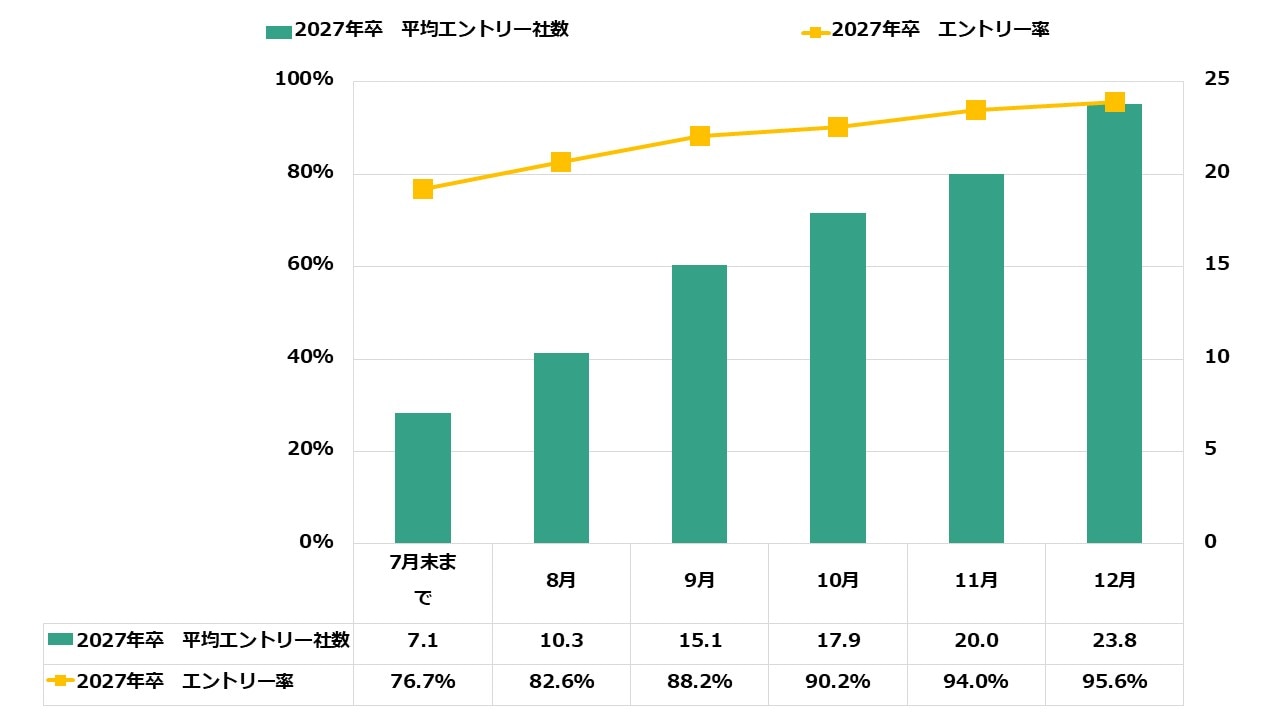 12月末時点のエントリー率は95.6%(前月比1.6ポイント増)に達し、志望企業への母集団形成をほぼ完了したと言えるでしょう。