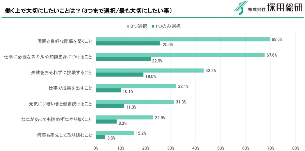 入社後、彼らが「働く上で大切にしたいこと」として最も多く挙げるのが「周囲との良好な人間関係(69.6%)」です。