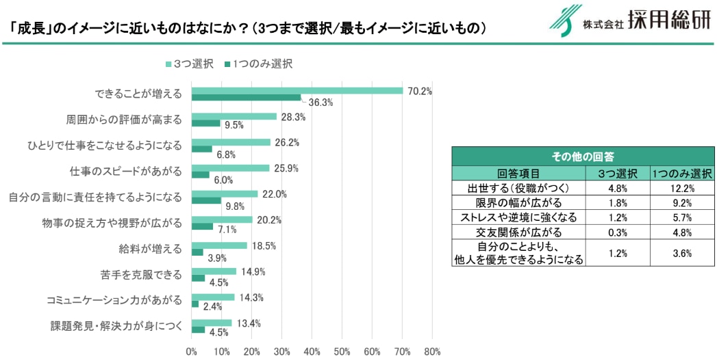 従来の「昇進・昇格」や「市場価値の向上」といった概念に対し、Z世代にとっての成長は、より個人的で実感値に近い「できることが増えること(70.2%)」に集約されます。