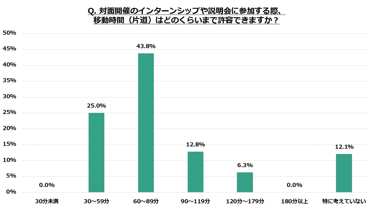 オンラインでの就活が定着したことで、タイパ重視の学生が増えており90分を超える移動時間には難色を示すこがわかります。