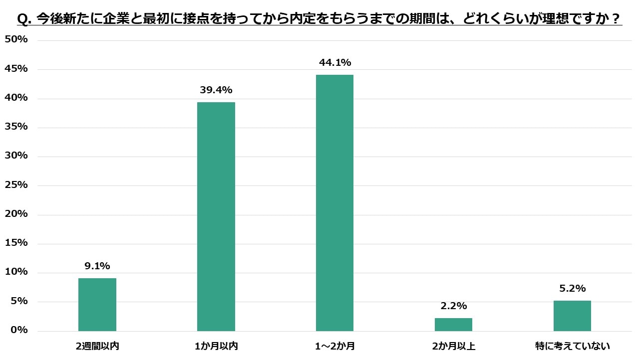 最も多くの回答を集めたのは「1~2か月」の44.1%でしたが、次いで「1か月以内」も39.4%と僅差で続く結果となりました。これらを合わせると、8割以上の学生が、今後接触する企業とは2か月以内での内定獲得を理想としていることがわかります。