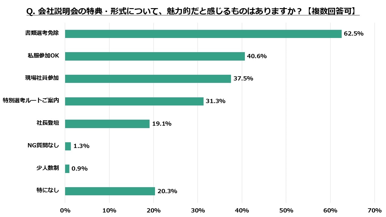 また、2位「私服参加OK」が40.6%に達しており、参加しやすい説明会の実施が参加率向上に有効であることがわかります。
