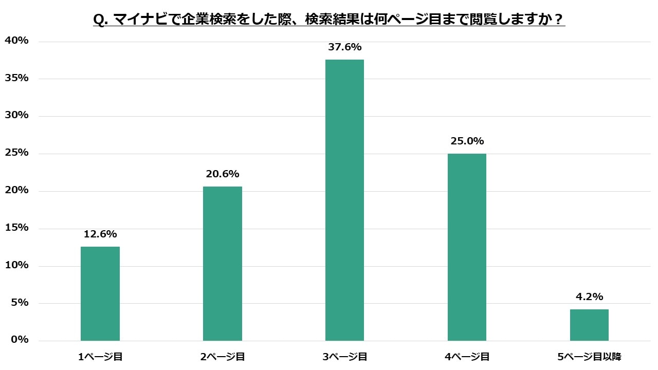 1位は「3ページ目」37.6%、2位「4ページ目」25.0%、3位「2ページ目」20.6%となりました。「1ページ目」は12.6%と全体の僅か1割強であり、ほとんどの学生が数ページ先まで比較検討する学生の姿勢が見て取れます。
