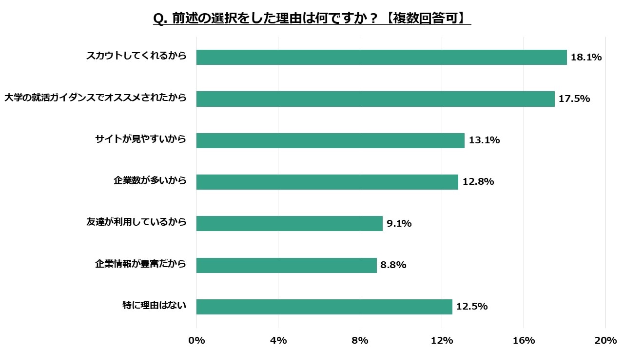 1位は「スカウトしてくれるから」で18.1%となりました。この時期では、就活情報サイトのマイナビやワンキャリアは企業探しだけではなく、企業からのスカウトを得られるメリットが大きいようです。