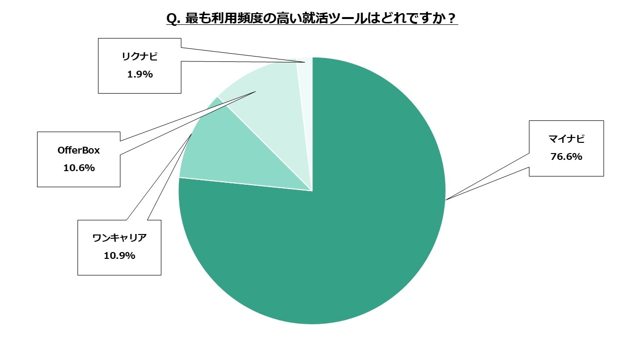 1位「マイナビ」が76.6%と、2位以下を大きく突き放して圧倒的な支持を得る結果となりました。一方で、前月2位の「OfferBox」を抜いて「ワンキャリア」が約4ポイント上昇の10.9%で2位となりました。