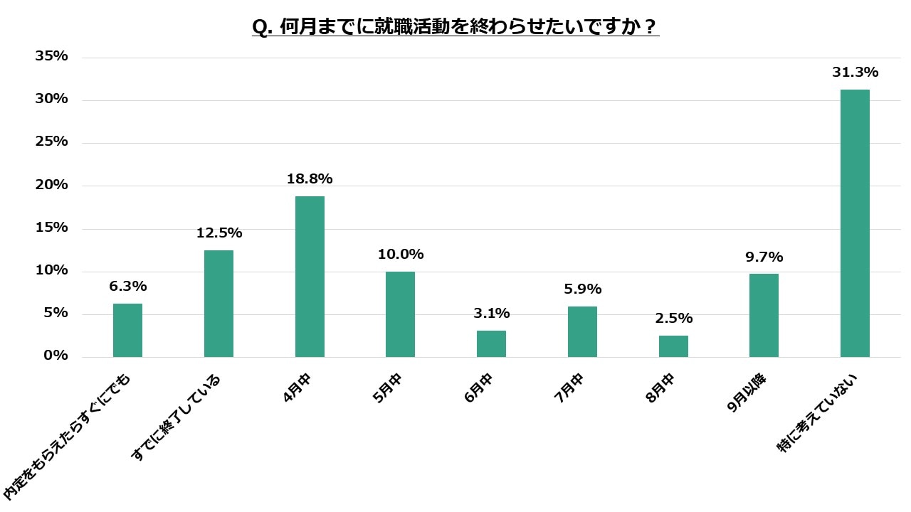 一方で、「内定をもらえたらすぐにでも」と「すでに終了している」を含めると6月中までに就職活動を終わらせたい学生も半数を占めており、企業としては早めに内定を出しつつ、学生によって異なる意思決定に対応していく必要に迫られそうです。