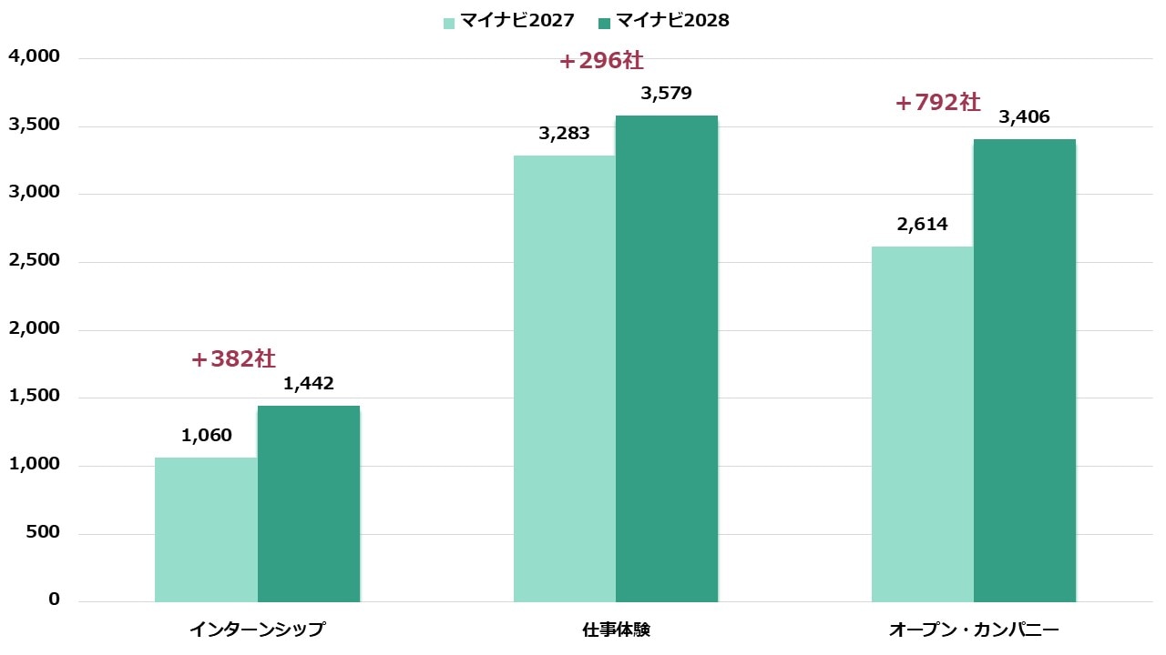 また、インターンシップ(+382社)や仕事体験(+296社)も増加しており 、早期の学生接触を図る企業の動きが前年以上に加速しています。