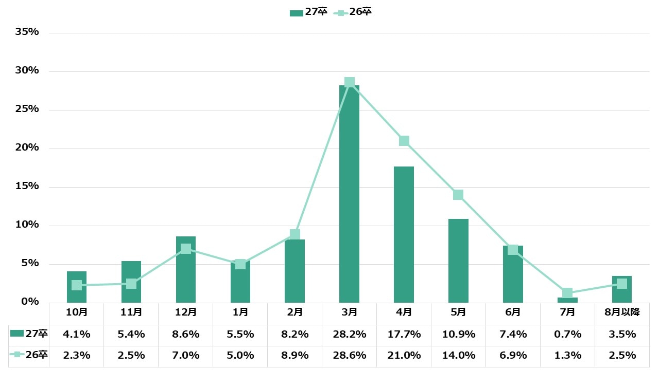 全体のピークは3月(28.2%)に集中しているものの、4月(-3.3pt)や5月(-3.1pt)の割合が前年より低下していることから、選考プロセスの前倒しが加速している現状が浮き彫りとなっています 。