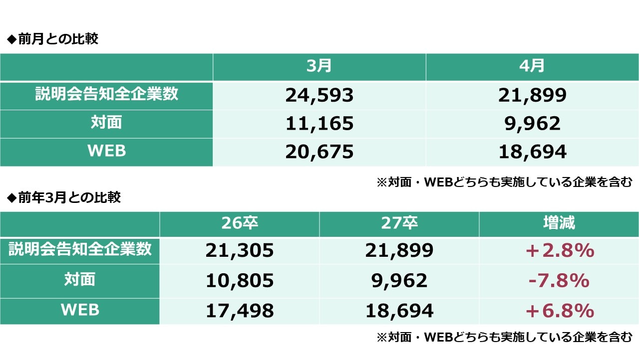 実施方法別では、対面説明会が10,805社から9,962社(-7.8%)に減少した一方で、WEB説明会は17,498社から18,694社(+6.8%)へと伸長しており、オンライン形式での実施が告知社数を押し上げる要因となっています 。