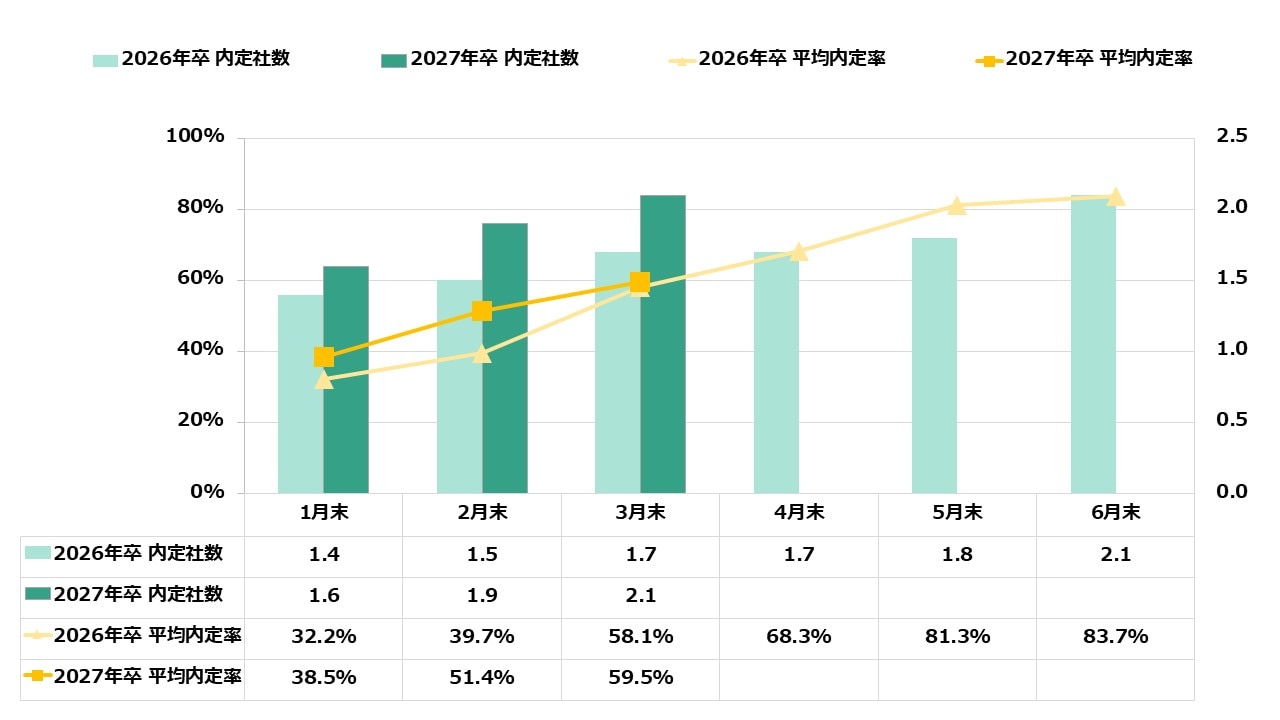 3月末時点の内定率は59.5%に達し、前年同時期の58.1%を上回るペースで推移しています。 内定社数は平均2.1社と、前年の1.7社から増加しており、早期から積極的に動いている学生が着実に複数の内定を確保している現状が分かります。