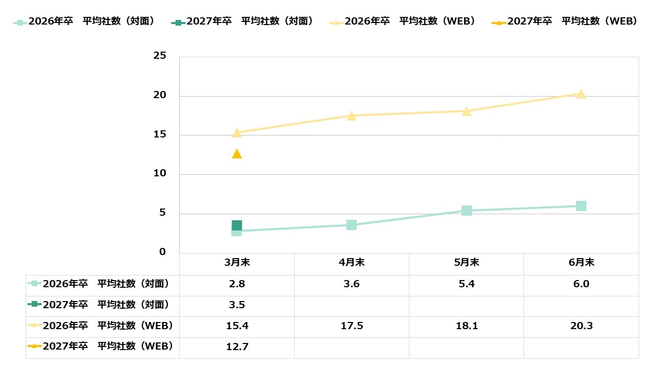前年同時期(WEB 5.5社/対面 2.2社)と比較してどちらも数値が上がっており、早い段階から積極的に選考に参加する学生が増えています。