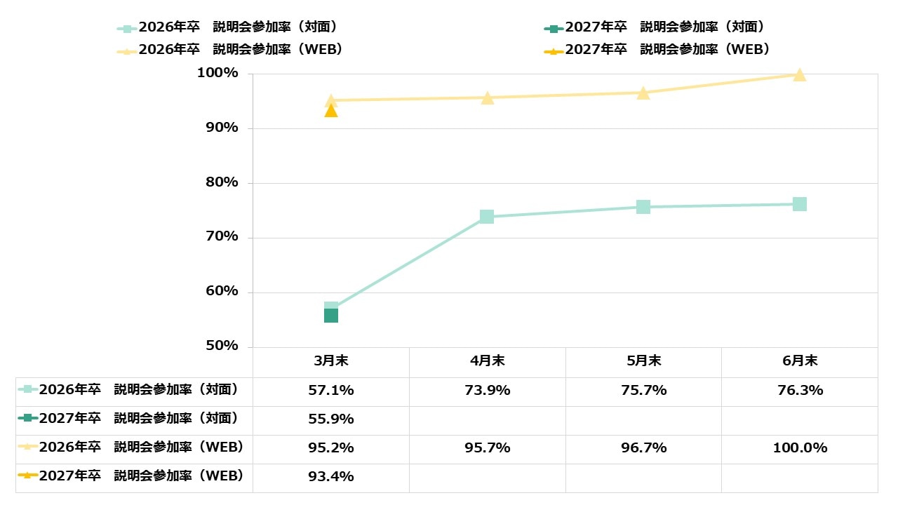 3月末時点でWEB説明会への参加率は93.4%に達していますが、前年同時期に比べるとわずかながら減少しています(-1.8ポイント)。
