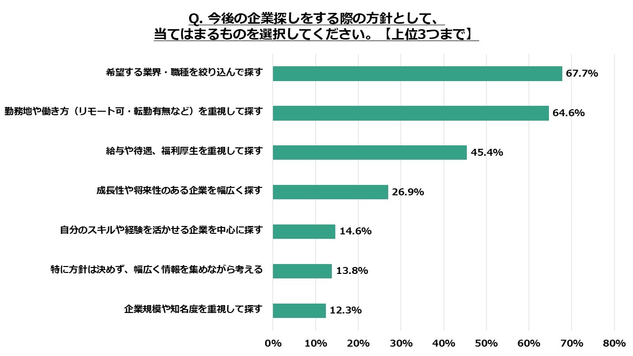 1位「希望する業界・職種を絞り込んで探す」67.7%、2位「勤務地や働き方(リモート可・転勤有無など)を重視して探す」64.6%と僅差で続く結果となり、3位は「給与や待遇、福利厚生を重視して探す」45.4%という結果となりました。