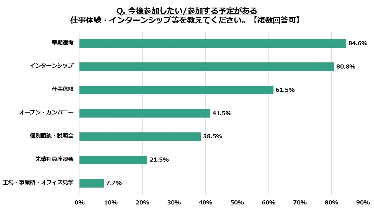 最も多く回答を集めたのは「早期選考」84.6%となり、2位「インターンシップ」80.8%、3位「仕事体験」61.5%、4位「オープン・カンパニー」41.5%という結果となりました。早期選考がインターンシップやオープン・カンパニー等を上回っていることから、学生が単なる情報収集や業務体験だけではなく、直接内定に結びつく機会を強く求めていることがうかがえます。