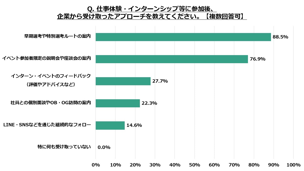 仕事体験・インターンシップ等に参加後、企業から受け取ったアプローチについて尋ねました。1位は「早期選考や特別選考ルートの案内」88.5%、2位「イベント参加者限定の説明会や座談会の案内」76.9%が3位以下と大きく差をつける結果となりました。