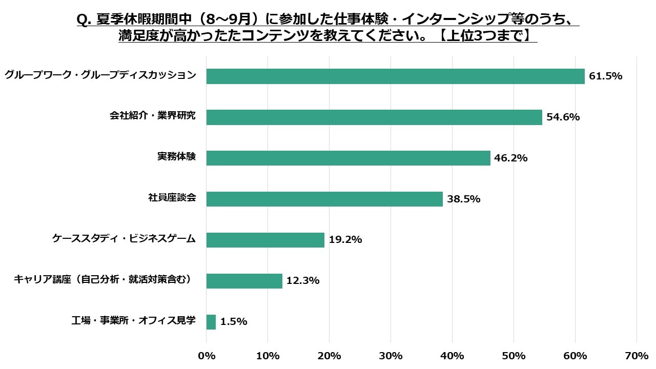 「グループワーク・グループワークディスカッション」が61.5%と最も多く、次いで「会社紹介・業界研究」が54.6%となりました。会社紹介や業界研究など就職活動の基本となるコンテンツに加え、グループワークやグループディスカッション、実務体験や社員座談会など、他者から学びを得ることができ、学生が能動的に関われるコンテンツは満足度が高いことがわかります。