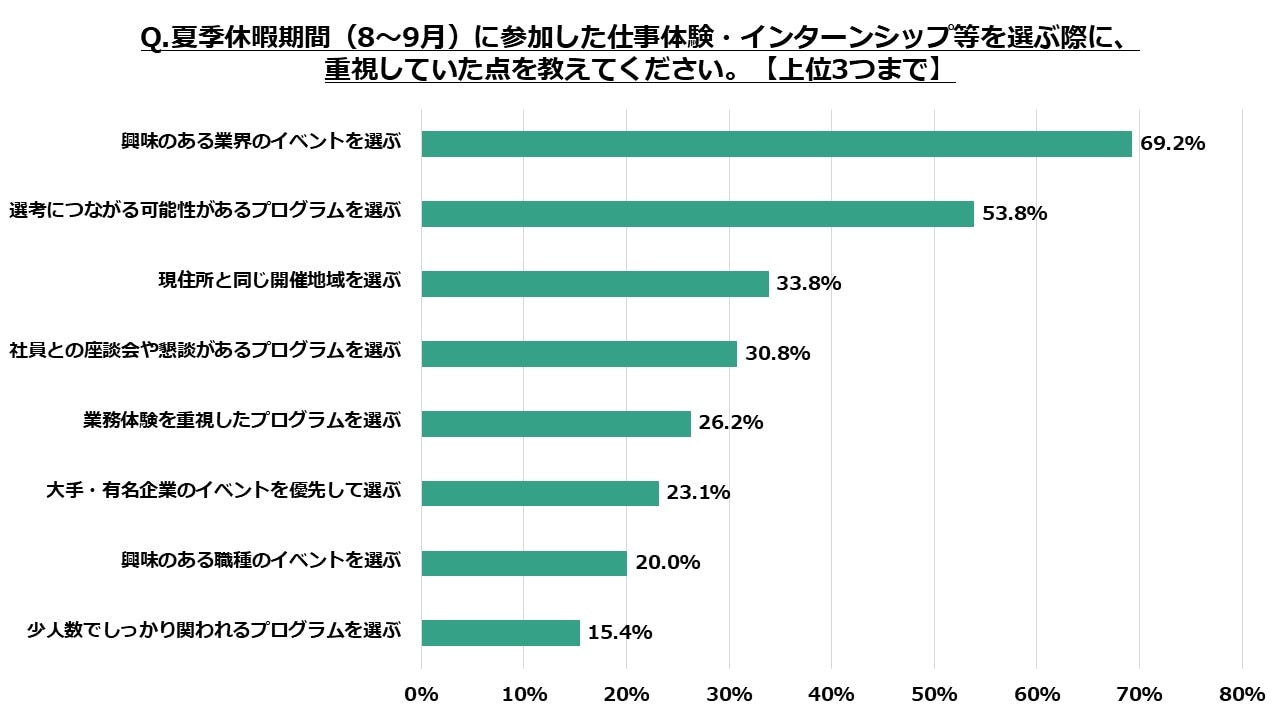 1位「興味のある業界のイベントを選ぶ」69.2%、2位「選考につながる可能性のあるプログラムを選ぶ」53.8%と、ともに5割を超える支持率となりました。また、「社員との座談会や懇親会のあるプログラムを選ぶ」と回答した学生が30.8%と3割以上の支持を獲得しており、「業務体験を重視したプログラムを選ぶ」26.2%を上回る結果となりました。