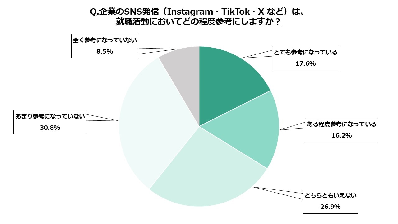 「とても参考になっている」が17.6%、「ある程度参考になっている」が16.2%で、約3割の学生がSNS発信を参考にしていることがわかりました。一方で、「あまり参考になっていない」が30.8%、「全く参考になっていない」が8.5%と4割近い学生が現時点ではあまり価値を感じていません。