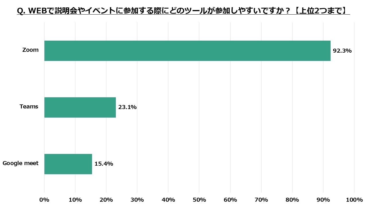 WEBで説明会やイベントに参加する際にどのツールが参加しやすいか尋ねました。「Zoom」が92.3%と圧倒的な支持を得る結果となりました。