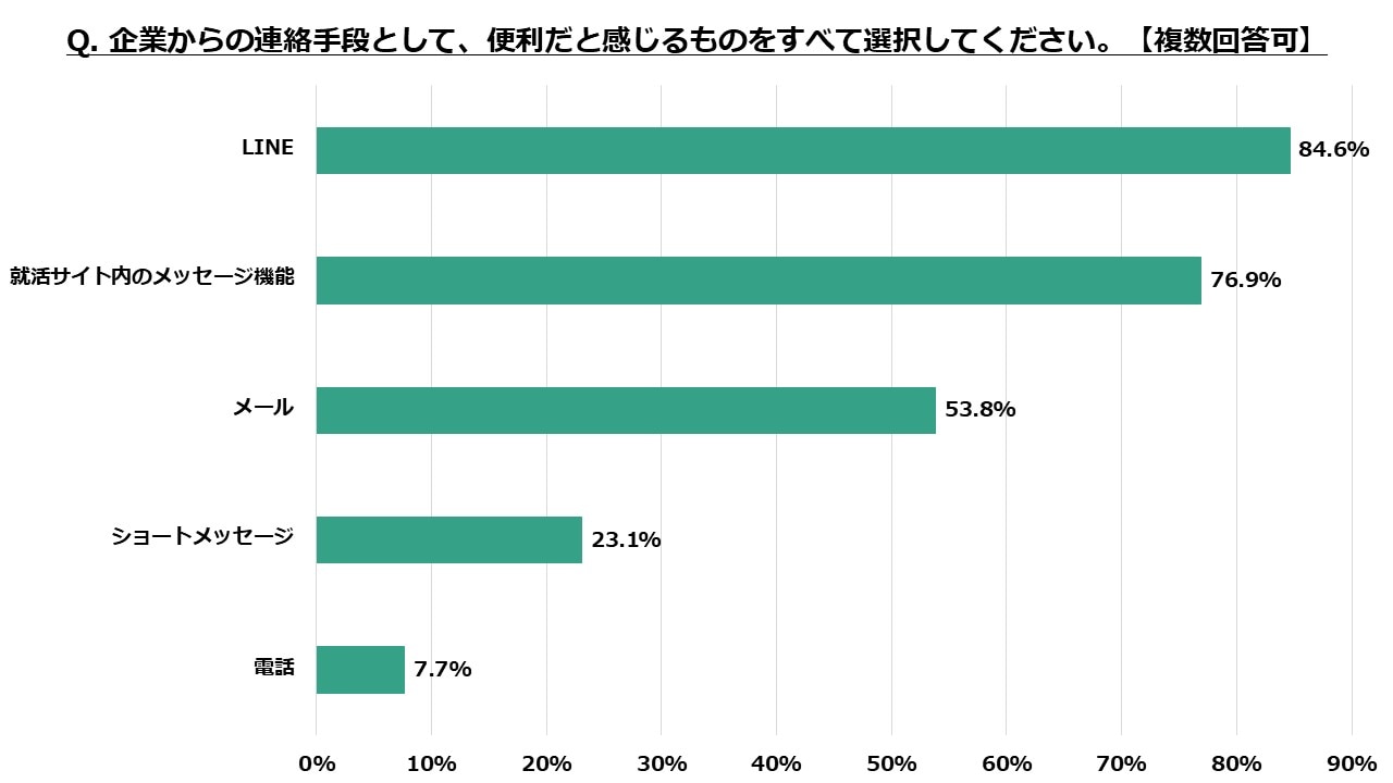 最も多く回答を集めたのは「LINE」84.6%という結果となりました。2位は「就活サイト内のメッセージ機能」となり、次に「メール」53.8%、「ショートメッセージ」23.1%、「電話」7.7%と続く結果となりました。