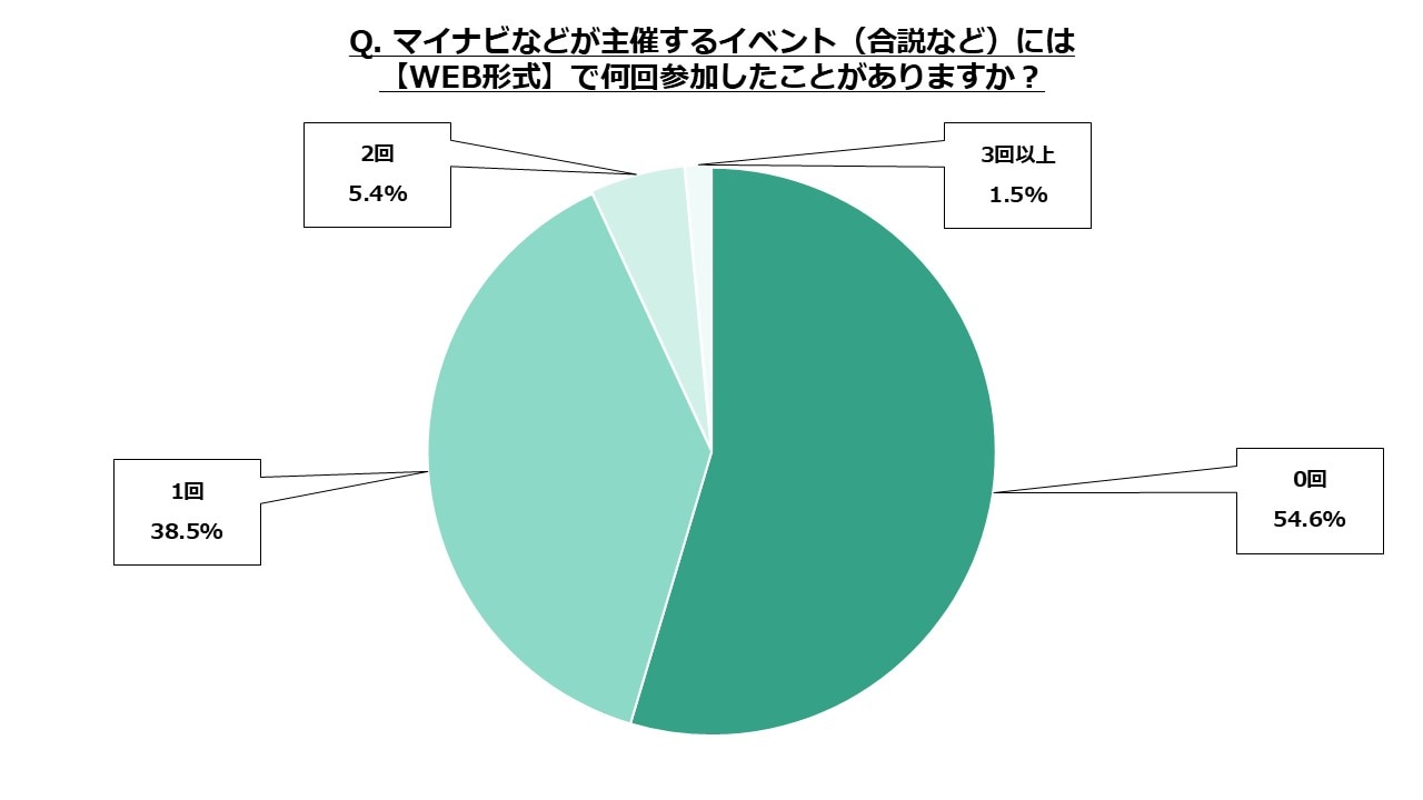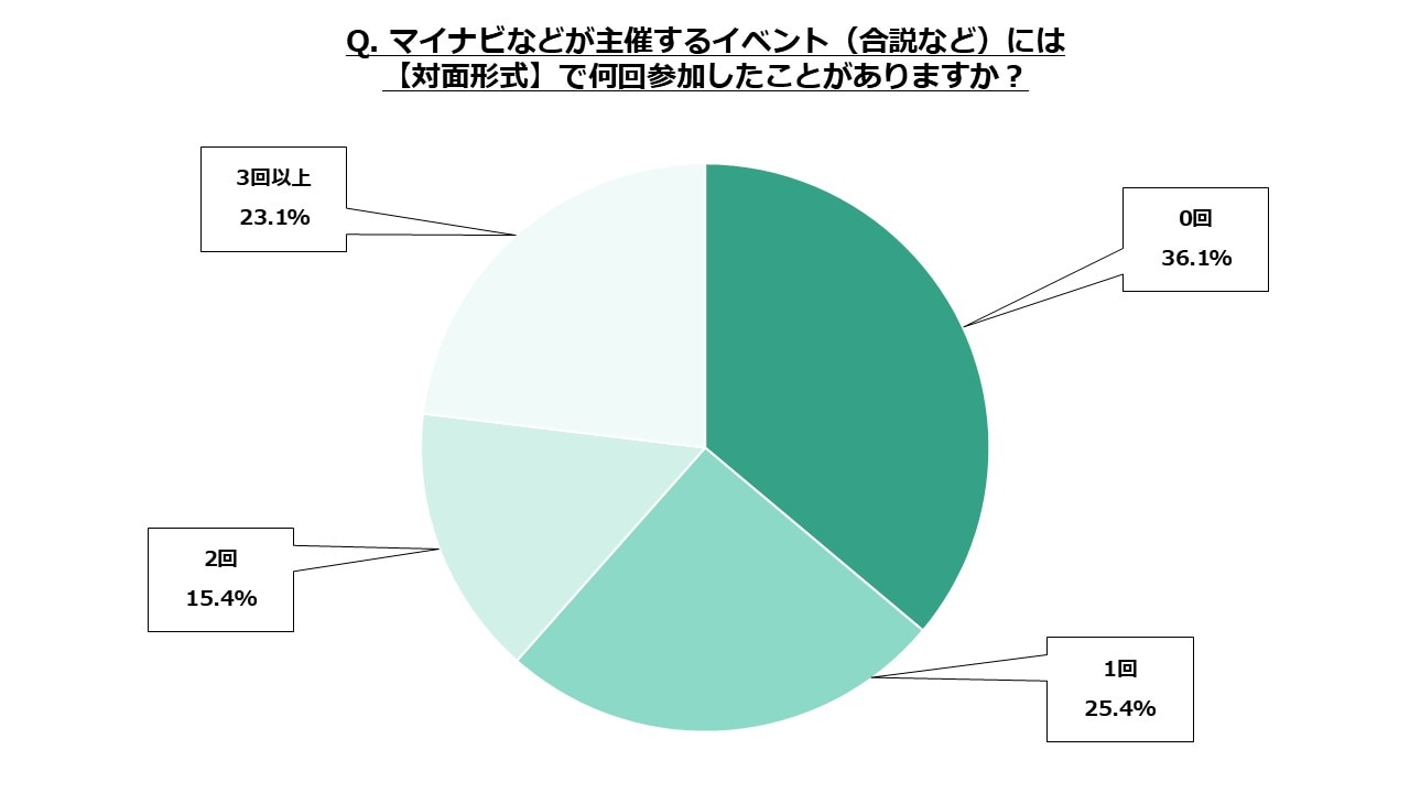 マイナビなどが主催するイベント(合説など)には対面形式で何回参加したことがあるかについて尋ねました。最も多く回答を集めたのは「0回」36.1%となり、「1回」25.4%、「3回」23.1%、「2回」15.4%と続く結果となりました。