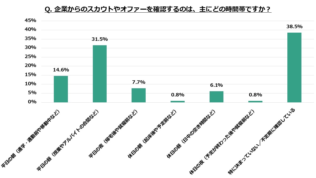 企業からのスカウトやオファーを確認する時間帯について尋ねました。最も多く回答を集めたのは「特に決まっていない/不定期に確認している」38.5%となりました。また、平日と休日を比較すると、平日の方が確認すると回答した学生が多く、特に「平日の昼(授業やアルバイトの合間など)」は31.5%と多くの回答を集める結果となり、次点に「平日の朝(通学中・通勤前や移動中など)」14.6%、「平日の夜(帰宅後や就寝前など)」7.7%が続くことからも、平日の朝~昼にかけて学生にスカウトを送信するのが推奨されます。