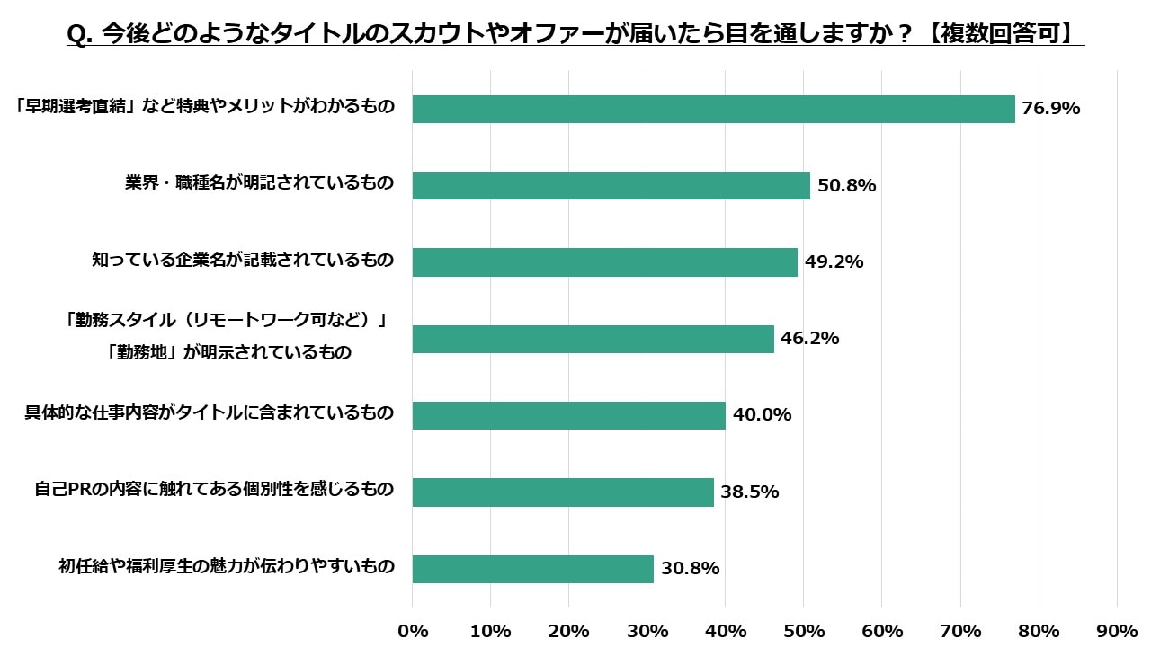 1位は「“早期選考” “○○限定” など特典やメリットがわかるもの」76.9%となり、2位「業界・職種が明記されているもの」50.8%、3位「知っている企業名が記載されたもの」49.2%、4位「“勤務スタイル(リモート可など)”“勤務地”が明示されているもの」46.2%と続く結果となりました。