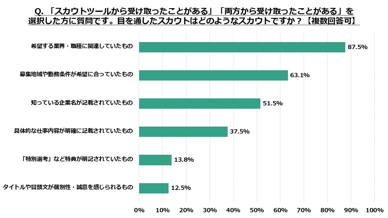 「希望する業界・職種に関連していたもの」が87.5%と最も多く、「募集地域や勤務条件が希望に合っていたもの」63.1%、「知っている企業名が記載されていたもの」51.5%と続く結果となりました。また、「特別選考など特典が明記されていたもの」が13.8%と一定の支持を得ていることがわかります。