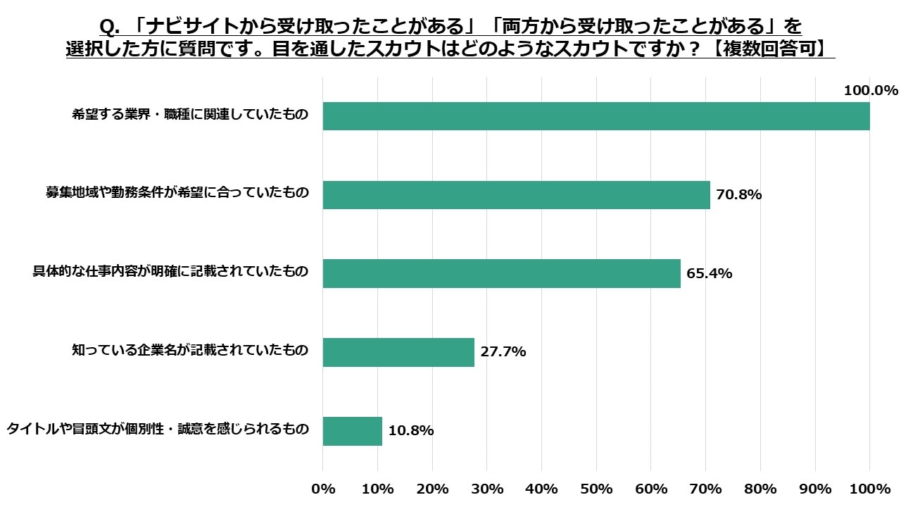 「希望する業界・職種に関連していたもの」は100.0%目を通されています。「募集地域や勤務条件が希望に合っていたもの」70.8%、「具体的な仕事内容が記載されていたもの」65.4%が続く結果となりました。