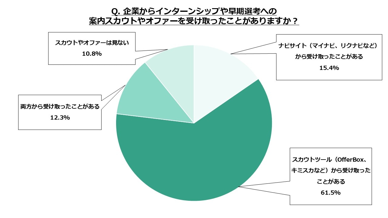 「スカウトツール(OfferBox、キミスカなど)から受け取ったことがある」が過半数を占める61.5%という結果となりました。「両方から受け取ったことがある」12.3%を含めると7割以上の学生がスカウトツールから早期選考の案内やオファーを受け取っていることがわかります。