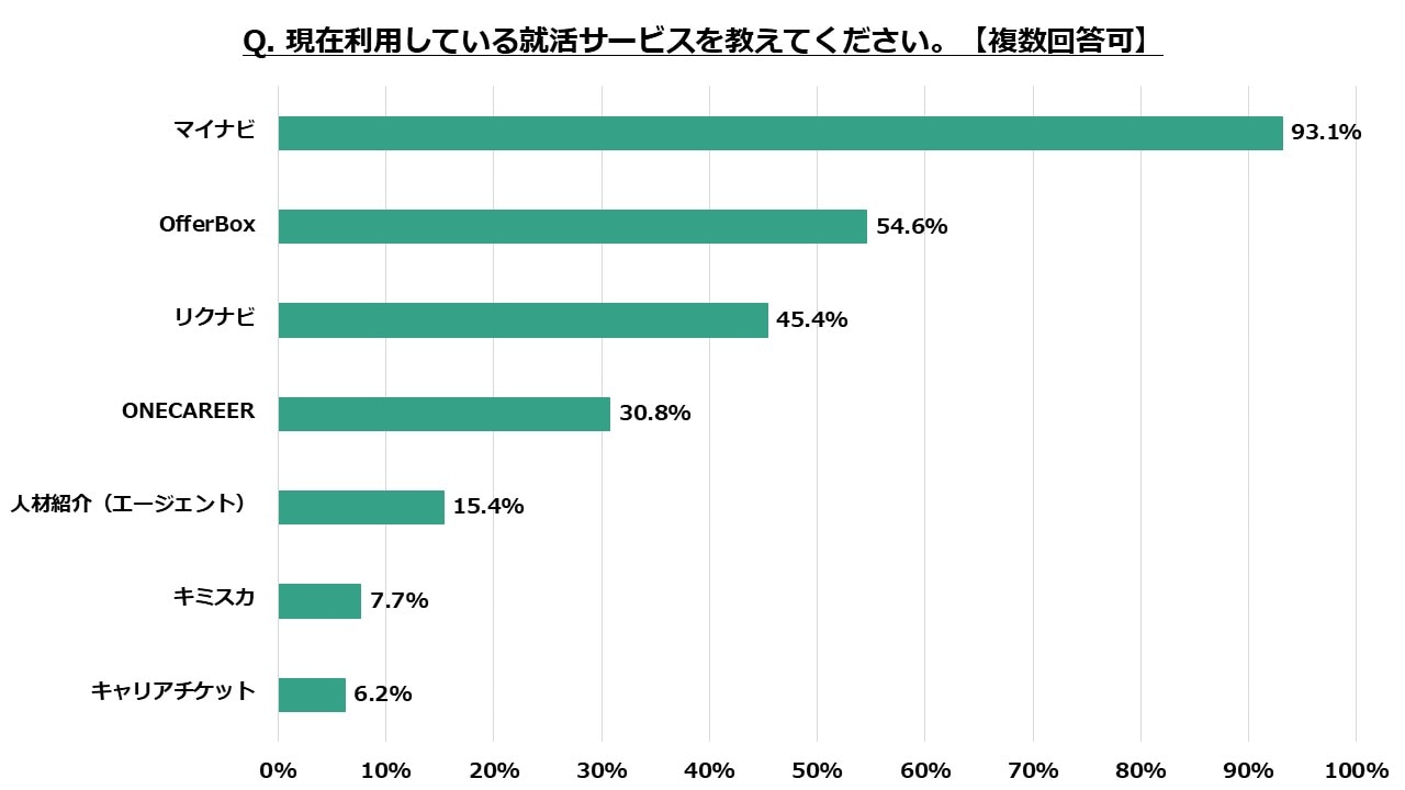1位は「マイナビ」93.1%、2位「OfferBox」54.6%、3位「リクナビ」45.4%という結果となりました。前月と比較して「OfferBox」の利用率が約15pt上昇していることから、スカウトで企業を探す学生の動きが活発化していることがうかがえます。
