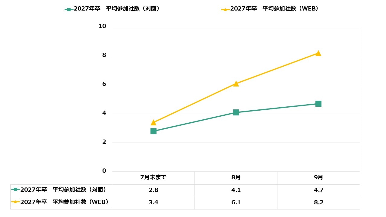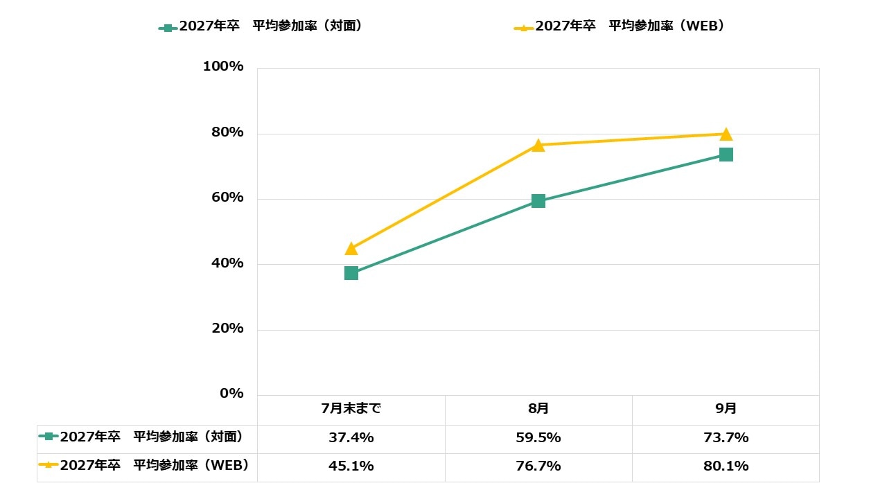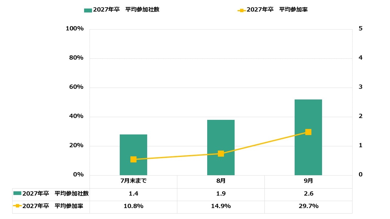 9月時点で平均参加社数は2.6社(前月+0.7社)、参加率は29.7%(前月+14.8pt)と急伸しました。すでに3割の学生が選考を受けていることになり、27卒採用についても非常に速い展開を見せています。
