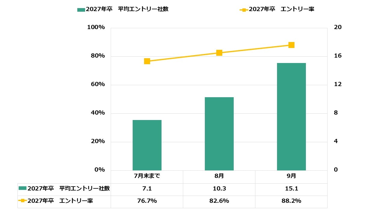 平均エントリー社数は15.1社(前月比+4.8社)と前月から順調に増加しています。多くの学生が夏休み最後の1か月を活用し、早期選考に向けた情報収集と企業比較を進めています。