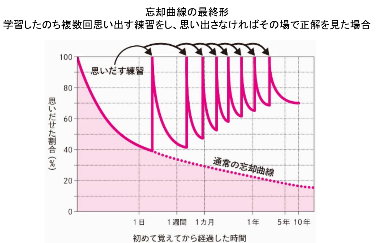 「エビングハウスの忘却曲線」によれば、人は復習しなければ時間の経過とともに急速に忘れてしまうものの、反復することで記憶は定着し、また再度学習する際にかかる労力も少なることがわかっています。
