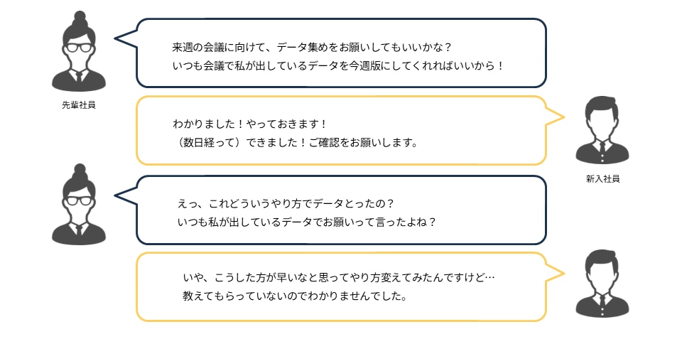上司が「会議用にいつものデータを更新して」と依頼したのに、新入社員は独自の方法で作成してしまう。